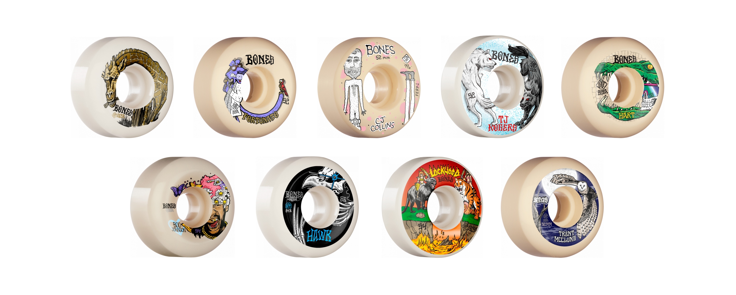 Doskladnila se také skejtová kolečka od renomované firmy Bones Wheels, na kterých jezdí snad každý. A kdo ne, ten je zřejmě ještě nezkusil. Krom doskladnění klasik Bones 100s White ve tvarech V4 a V5 s velikostí od 52 mm do 54 mm. Na shop dorazila hlavně spousta nových promodelů, mezi kterými je i nová žirafa od Marka Zápražného. Mezi další promodel patří TJ Rogers, CJ Collins, Boo Johnson, Tony Hawk, Gabriel Fortunato, Trent McClung, Cody Lockwood a Kelly Hart.